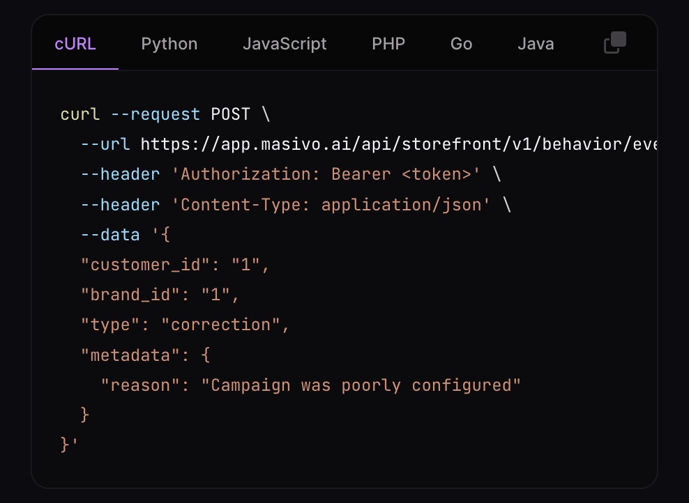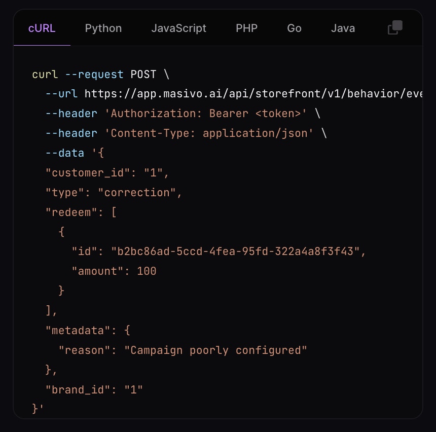 You don’t need to create a customer event type for this operation. But we recommend you to emit and event with a custom ‘type’ as shown in the example below. Use the Emit event endpoint to emit a new event including the rewards you would like to subtract from the customer’s balance. You will need to use the ‘redeem’ field in the top level of the event. This field does not validate if a reward can be redeemed, so you can use it to subtract funds arbitrarily.Include in the metadata a ‘reason’ field to explain why the balance was
