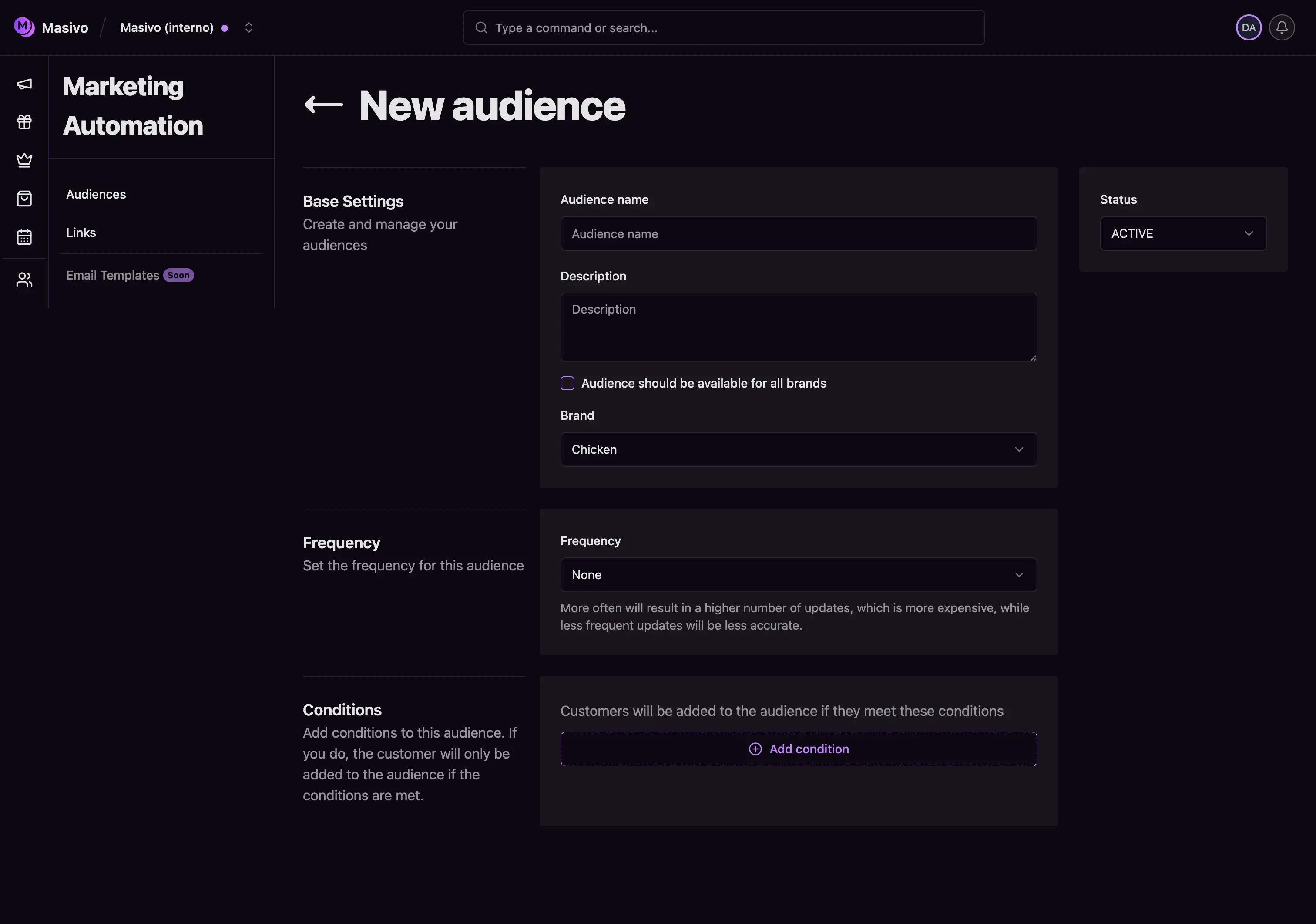 Navigate to Marketing Automation > Audiences in your dashboard. This is your control center for creating and managing customer segments that power your automated marketing campaigns. Click the New audience button to start building your first dynamic customer segment.Step 2: Configure your audience foundation