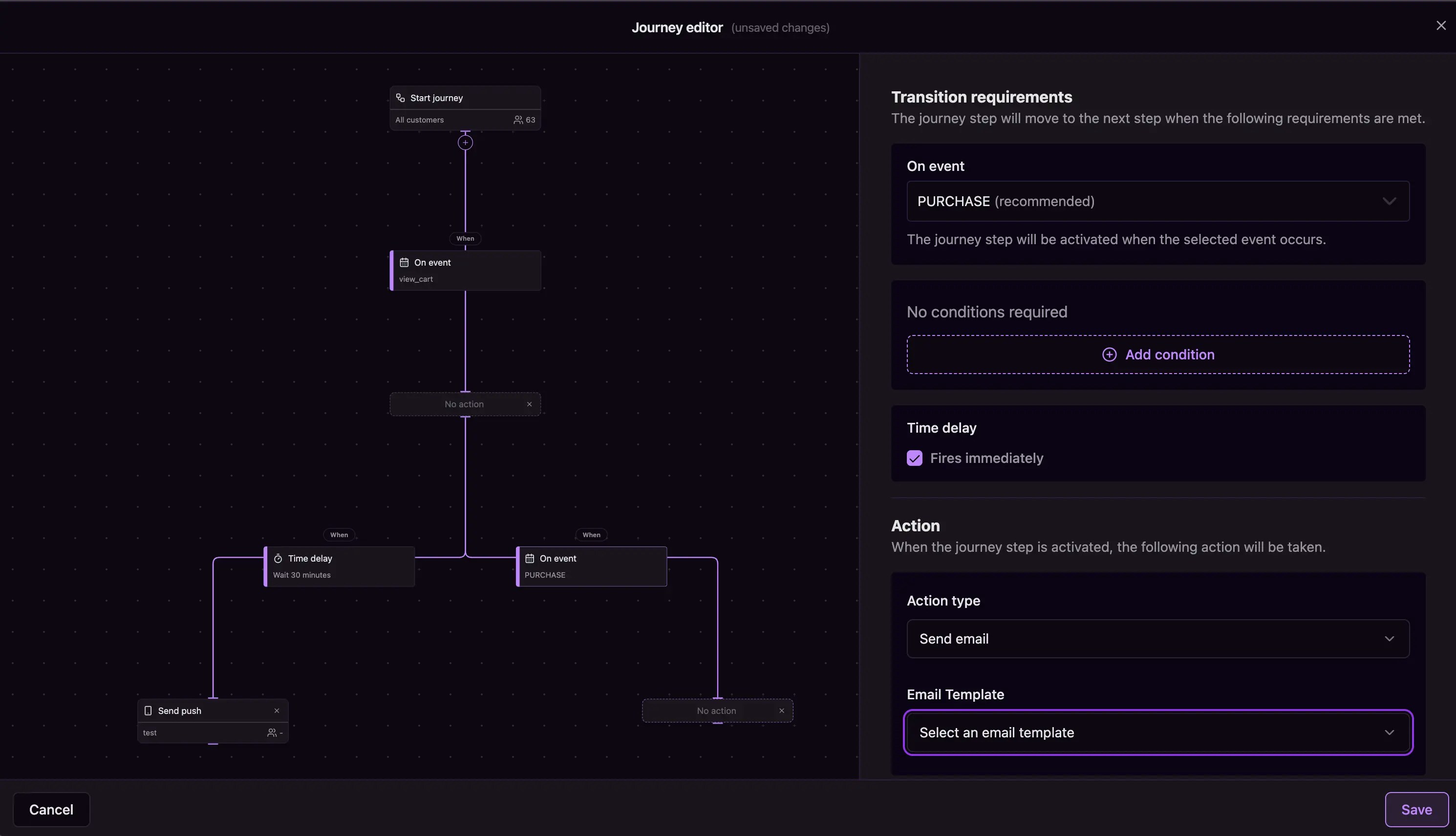 When you select Send email or Send push notification actions, you’ll choose from your existing templates: For email actions: Select from your email templates or create new ones directly from the journey editor. For push actions: Choose from your push notification templates to maintain consistent messaging.If you don’t have templates yet, create them first using the Email Templates