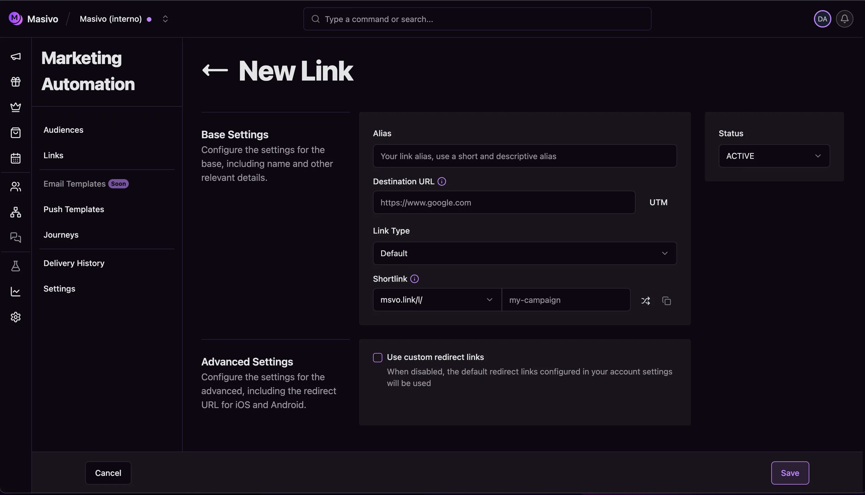 Links are the backbone of marketing automation measurement in Masivo. They enable you to track and analyze every marketing flow, whether you’re using standalone links or embedding them within push notifications, emails, or journey workflows.